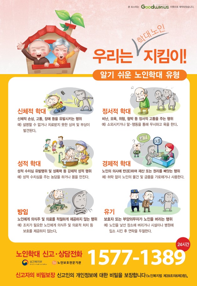 노인학대예방을 위해 저희 기관은 이렇게 합니다. 최고관리자 0 1105 01.23 19:28 1.우리기관은 모든 수급자(보호자)에게 노인인권보호지침을 제공합니다. 2.우리 기관에는 노인 학대에 관한 정보를 게시 및 수록하고 있습니다.3.모든 직원에게 노인 인권 및 학대예방교육을 분기별 1회 이상 실시합니다.4.우리 기관은 모든 수급자에게 노인 인권 및 학대예방교육을 분기별 1회 이상 실시하고 있습니다.5.노인 학대를 예방하기 위해 반기별 1회 이상 운영위원회 회의에 수급자또는 보호자 대표를 1인 이상 참여시켜 수급자의 요구사항과 불만사항을 청취하고 조치합니다.