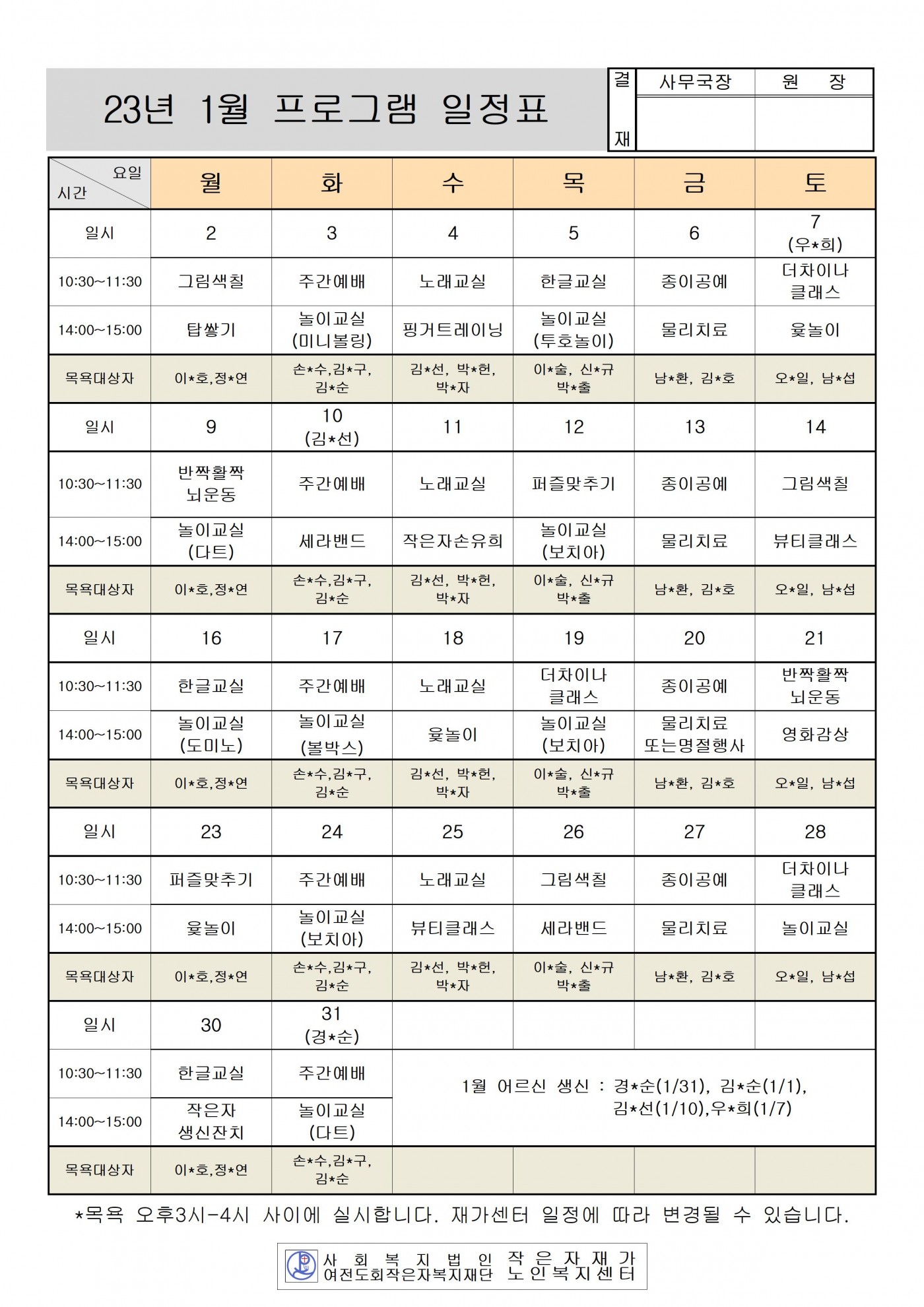 2023년 4월 프로그램 일정표(작은자재가노인복지센터)