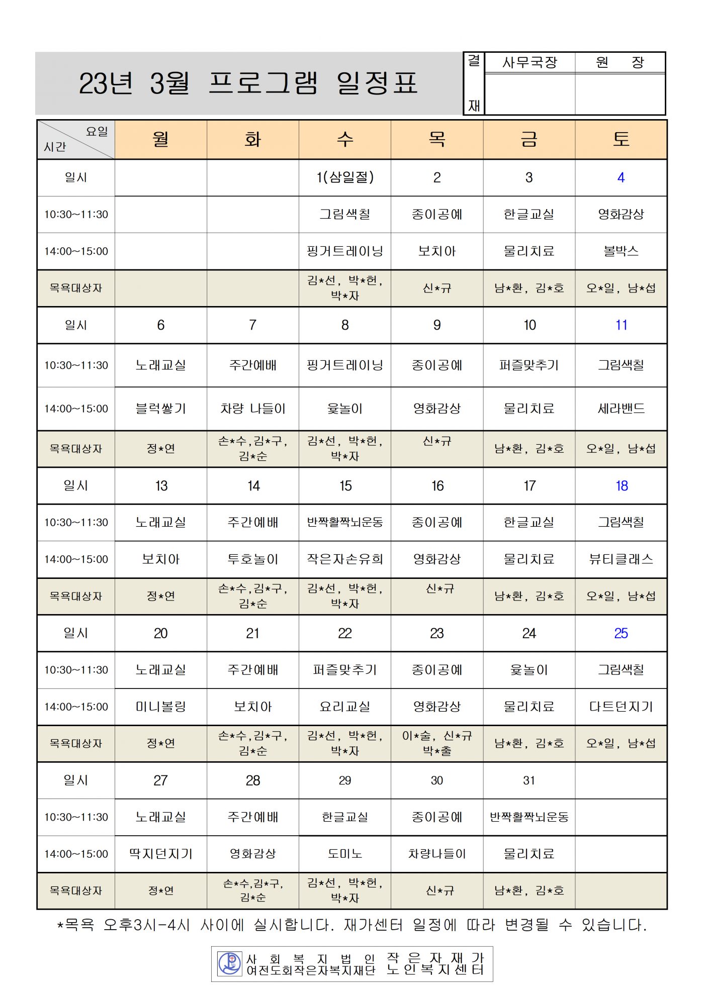 2023년 4월 프로그램 일정표(작은자재가노인복지센터)