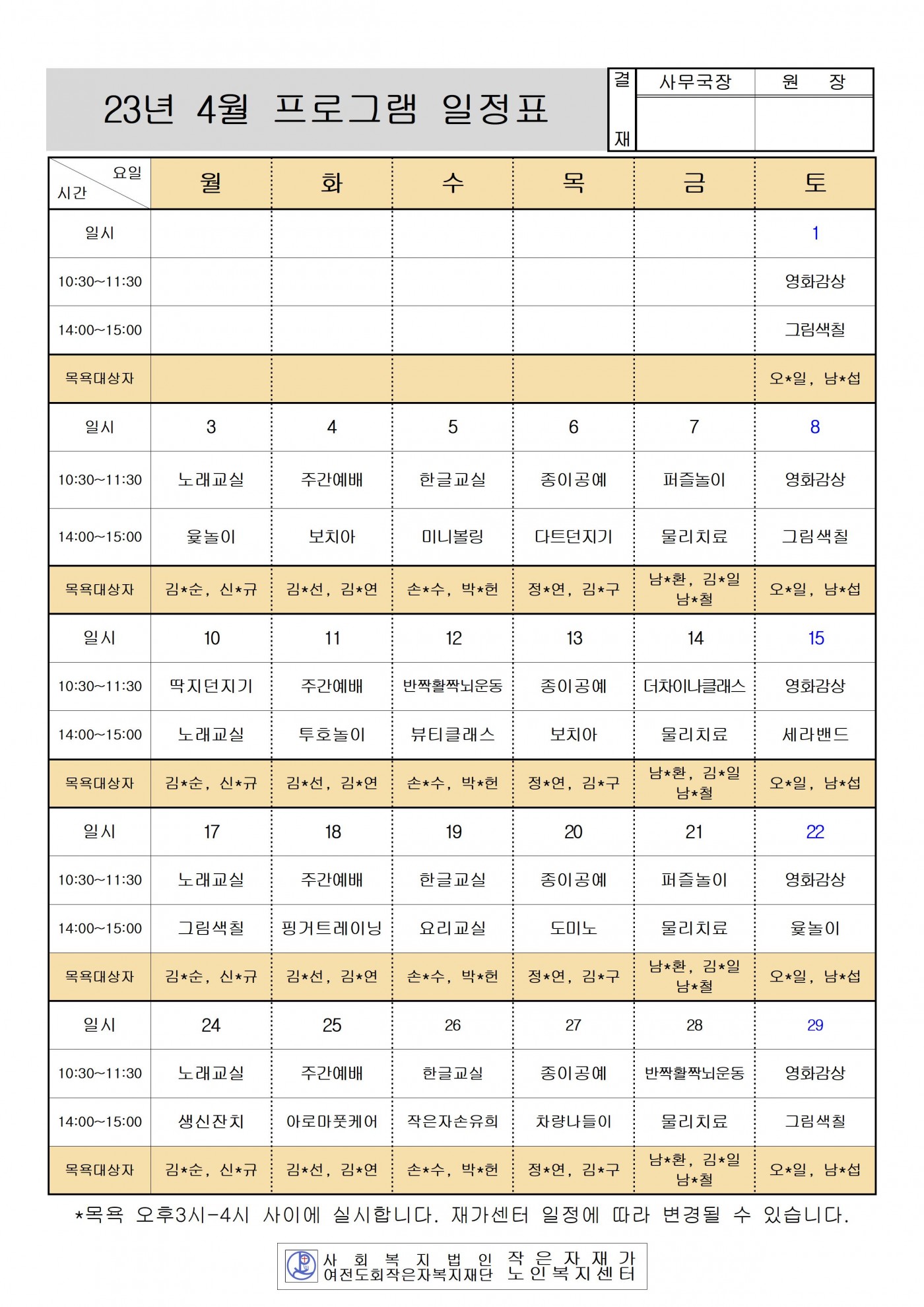 2023년 4월 프로그램 일정표(작은자재가노인복지센터)